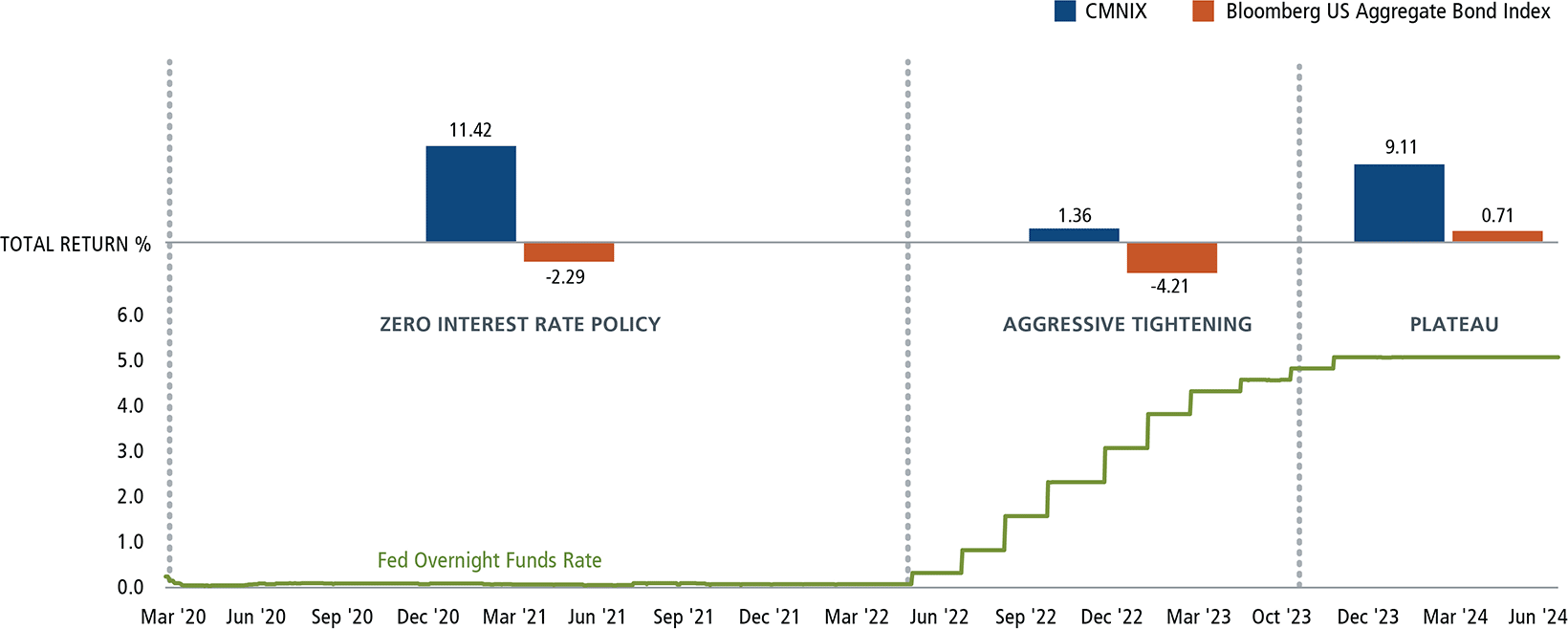 Past performance is no guarantee of future results. Source: Morningstar Direct and St. Louis Federal Reserve as of 6/30/2024. “Rates near zero” period includes 3/16/2020-3/16/2022, “Aggressive tightening” period includes 3/17/2022 to 5/3/2023 and “Plateau” period includes 5/4/2023 to 6/30/2024. Returns are cumulative.