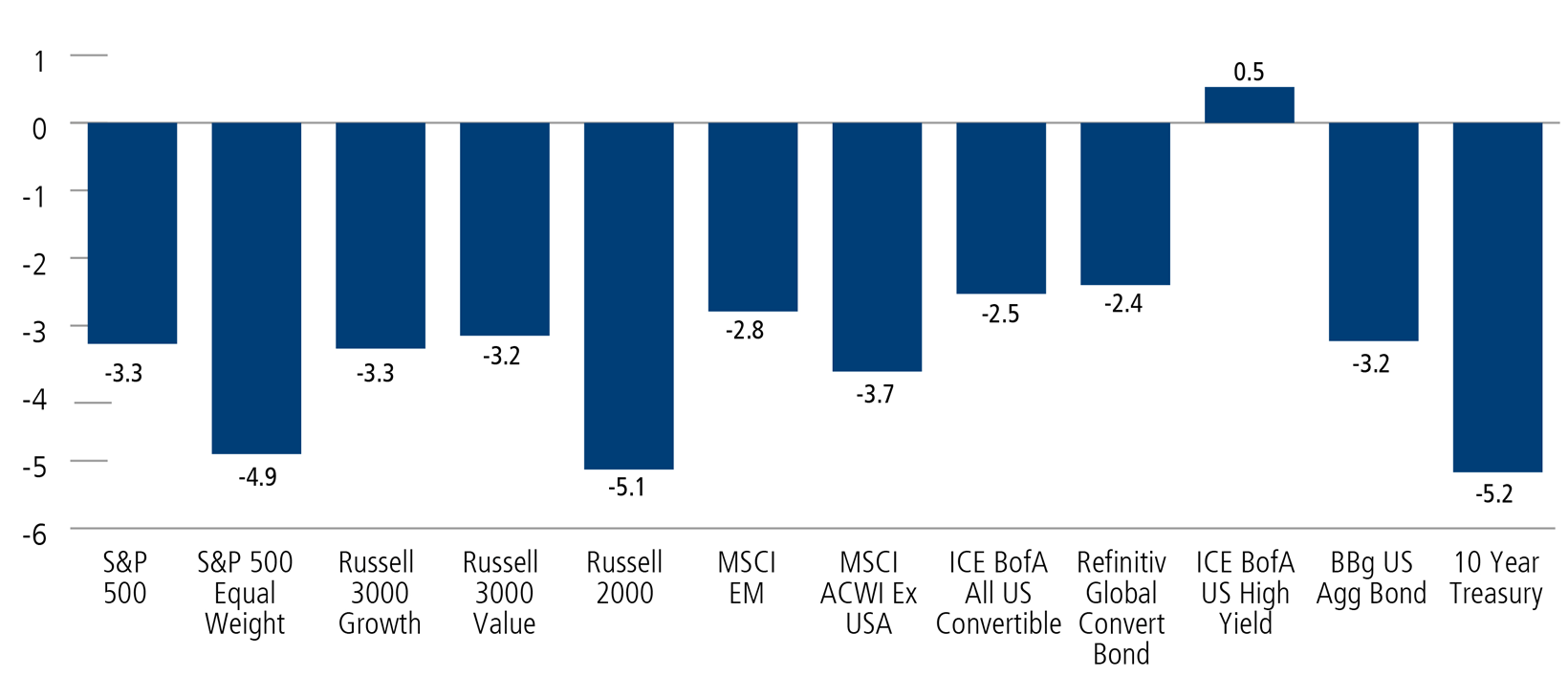 Indexes are unmanaged, do not include fees or expenses and are not available for direct investment. The US Dollar Index measures the value of the US dollar relative to a basket of foreign currencies, including Euro Area, Canada, Japan, United Kingdom, Switzerland, Australia, and Sweden. The S&P 500 Index is considered generally representative of the US equity market and is market cap weighted. The MSCI All Country World Index represents the performance of global equities. The MSCI All Country World ex USA Index represents the performance of global equities, excluding the US. The MSCI Emerging Markets Index is a measure of the performance of emerging market equities. The ICE BofA US High Yield Index is an unmanaged index of US high yield debt securities. The ICE BofA All US Convertible Index (VXA0) is a measure of the US convertible market. The Refinitiv Global Convertible Bond Index measures the performance of the global convertible market. Oil is represented by current pipeline export quality Brent blend. The Bloomberg US Aggregate Bond Index is a broad based benchmarks of the US investment grade and global investment grade bond market, respectively. They include Treasury, government related, corporate and securitized fixed-rate bonds. The Russell 2000 Index is a measure of US small cap performance. The Russell 1000 Index is a measure of US large cap performance. The Russell 3000 Index measures the performance of 3,000 publicly held US companies based on total market capitalization, which represents approximately 98% of the investable US equity market. The Russell 3000 Growth Index is representative of those Russell 3000 Index companies with higher price-to-book ratios and higher forecasted growth values. The Russell 3000 Value Index is representative of those Russell 3000 Index companies with lower price-to-book ratios and lower forecasted growth values. The MSCI Japan Index is designed to measure the performance of the large and mid cap segments of the Japanese market. The Citigroup Economic Surprise Index measures economic data versus expectations.