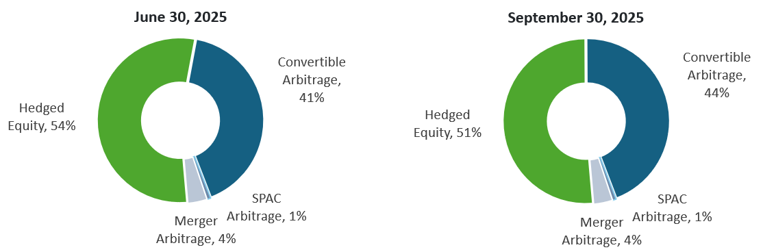 We believe one of the fund’s key advantages is our flexibility to adjust our allocations on an ongoing basis, versus funds with more static rebalancing strategies. That said, the most significant change during the quarter was an increased allocation to convertible arbitrage, funded by a modest reduction in the hedged equity sleeve. This reallocation reflected the extraordinary new issuance environment that has developed over the first three quarters of the year.